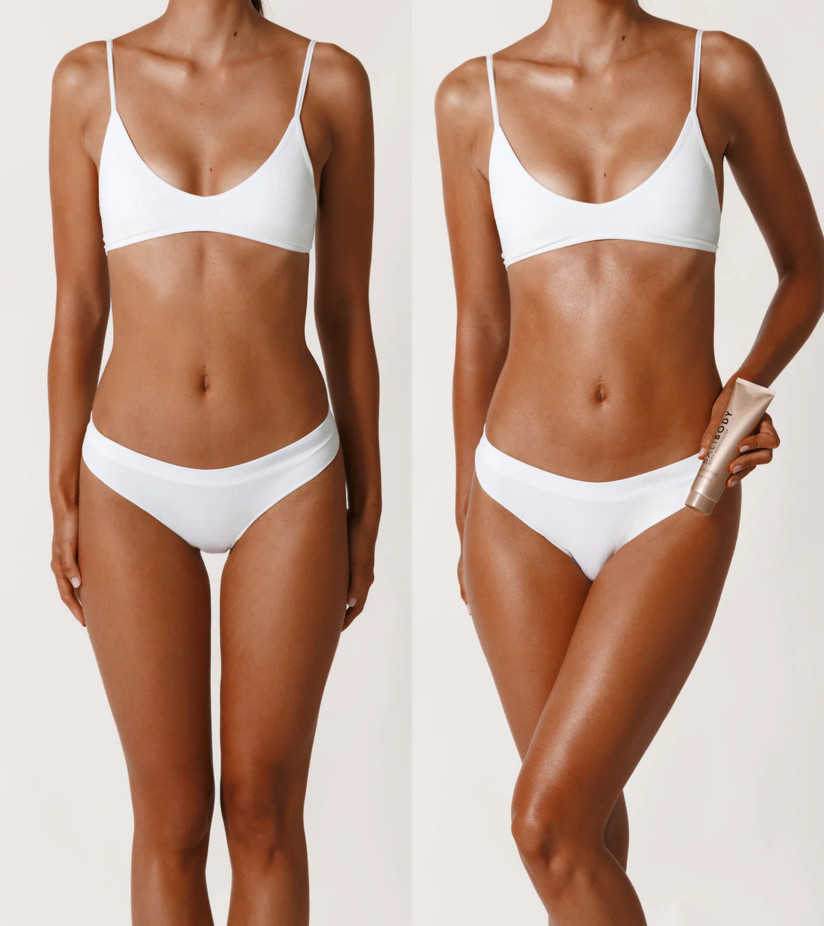Achieve a soft focus, blurring finish with a glossy skin tint on your arms, legs, décolletage or wherever you want.